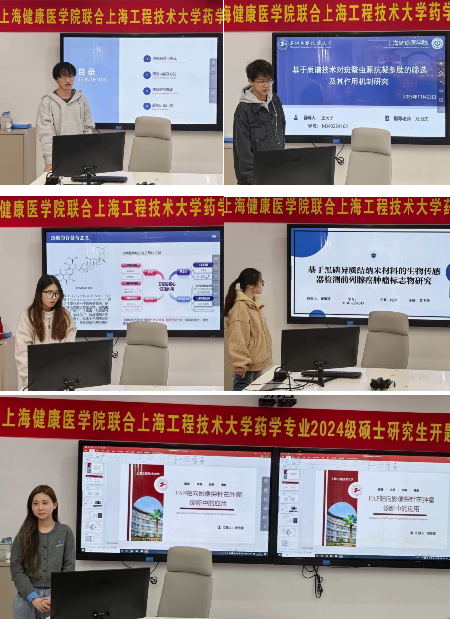 近日,上海健康医学院与上海工程技术大学联合培养药学专业2024级硕士研究生开题答辩会在我校南苑8号楼202课程中心顺利举行。答辩委员会由华东师范大学江文正教授、上海工程技术大学李亚教授、尹学博教授共同组成。2024级联合培养药学专业硕士生及导师全程参与。