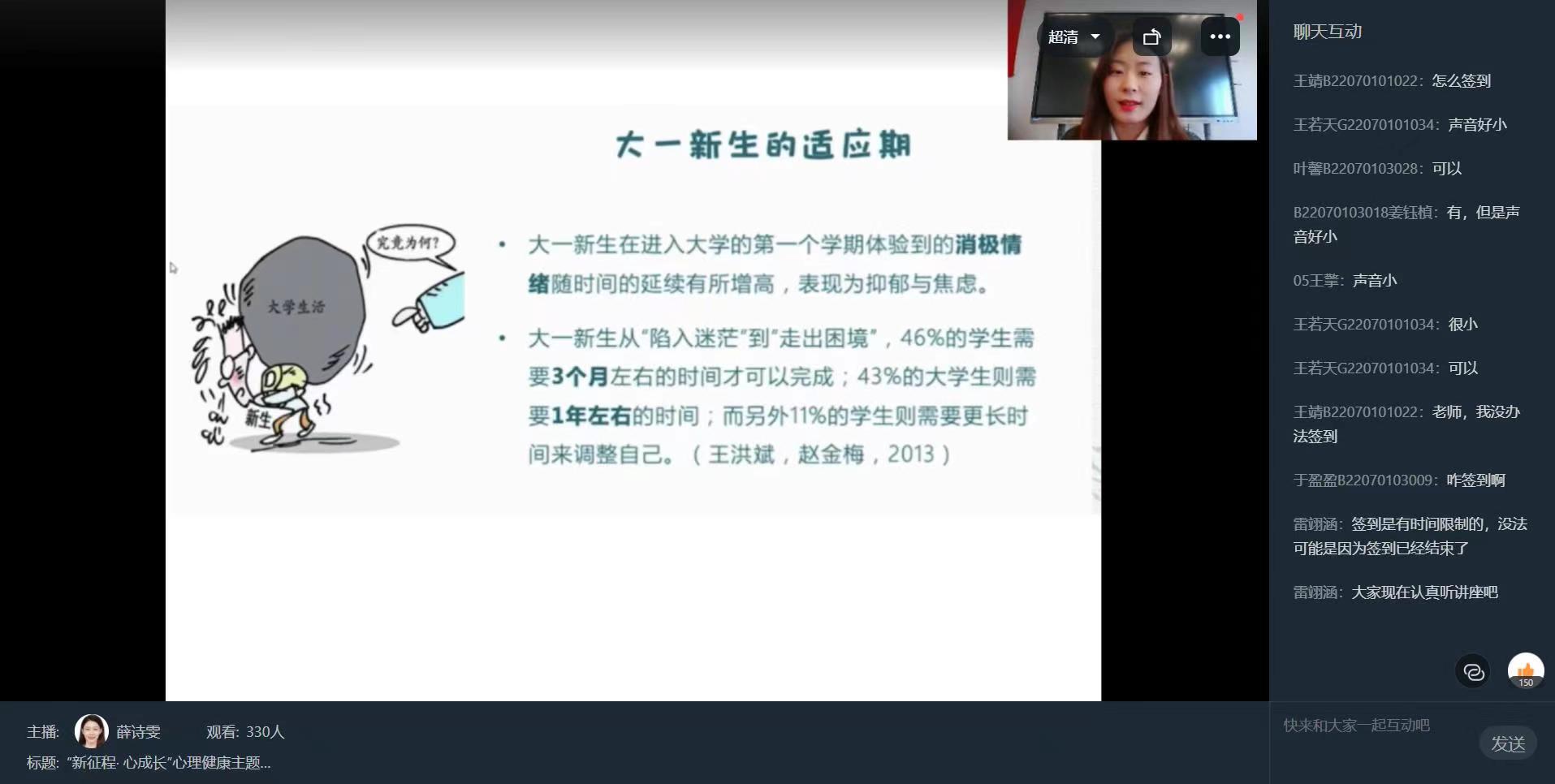 2022年10月20日下午15时,药学院2022级新生入学教育之心理健康教育主题讲座在线上钉钉会议室举行。本次讲座由药学院心理协会承办,药学院心理协会指导老师、国家三级心理咨询师薛诗雯老师主讲,薛老师以“新征程·心成长”为主题,用详实的案例,生动的图片,幽默的语言,为同学们带来了一场精彩的心理健康讲座。
