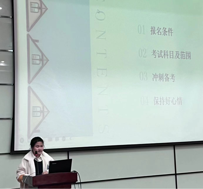 朱景怡从报名条件、考试科目及范围、冲刺备考、保持良好心态来进行分享。她提到药学专业可报考本校的专业有:药学、医学检验技术、卫生检验与检疫。并且她补充到题目较为基础,不必害怕,考纲中“简单应用”“综合应用”的知识点为重点,需能灵活应用就可应对。