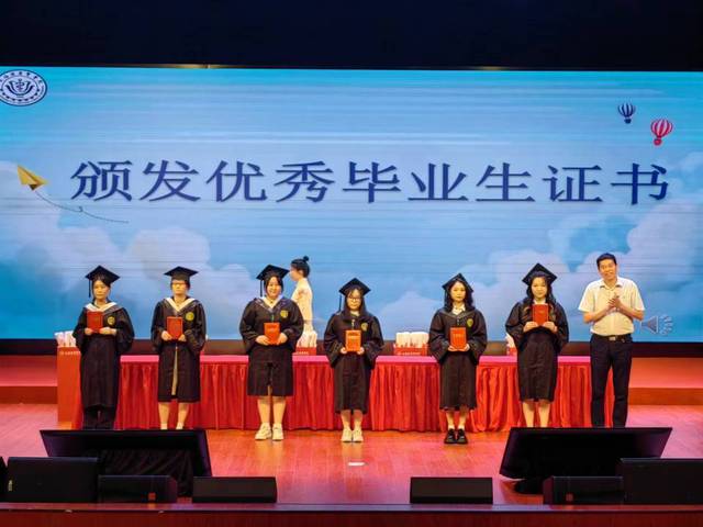 詹昌明为优秀毕业生代表颁发证书,并对他们寄予祝福。祝愿同学们怀着感恩之心,满载着对未来的畅想和憧憬,驾驭生命之舟,在新的岁月里直挂云帆,乘风破浪,驶向成功的彼岸!祝福同学们在今后的人生道路上,身体健康,工作顺利,事业有成!母校永远是你可以停靠的港湾。