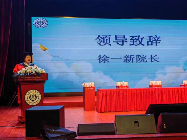 典礼开始,徐一新上台为毕业生们致辞。希望各位毕业生们要大胆的去创新、去实践、去拼搏、去挥洒汗水、去激荡青春、去独立“面对世界”和“改造世界”。愿云彩、艳阳一直陪伴你走到海角天涯;鲜花、绿草相随你铺展远大的前程。