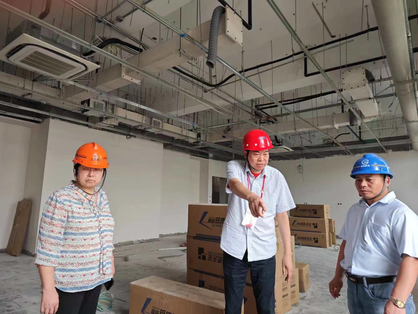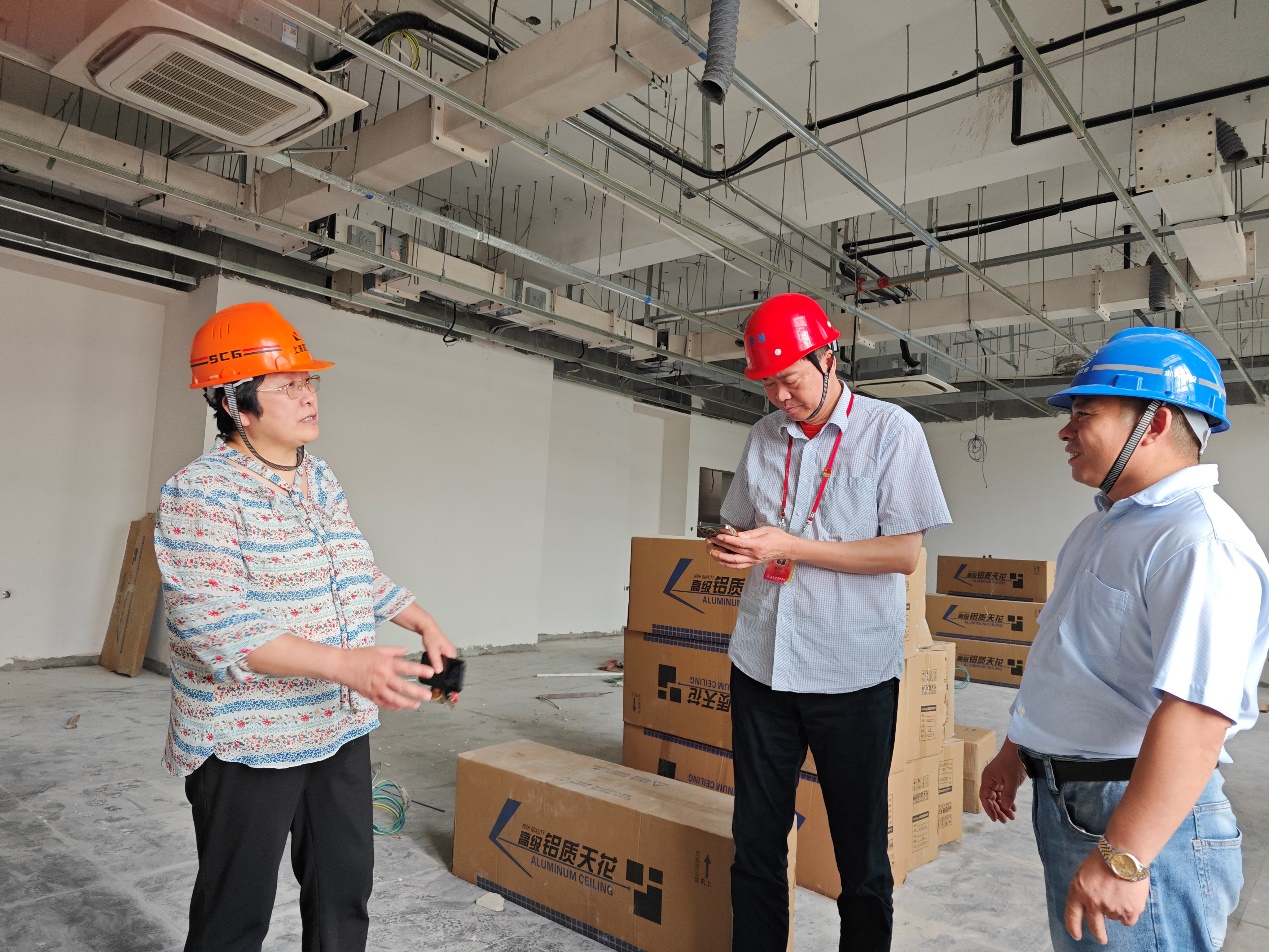 在检查中,详细听取了总承包公司何经理的工程进度情况:工程已经进行了75天,按计划进度完成了4楼、5楼改造的95%、2、3楼85%、1楼50%,基本按照进度完成,工程至今零事故。 詹书记对现场中存在的施工质量如线路、空调、防护保护等提了相关建议和要求;徐院长特别关心工程进展情况和整体质量,详细询问了施工进度及各工种衔接情况,要求总包保质保量的完成,保证教学顺利进行。