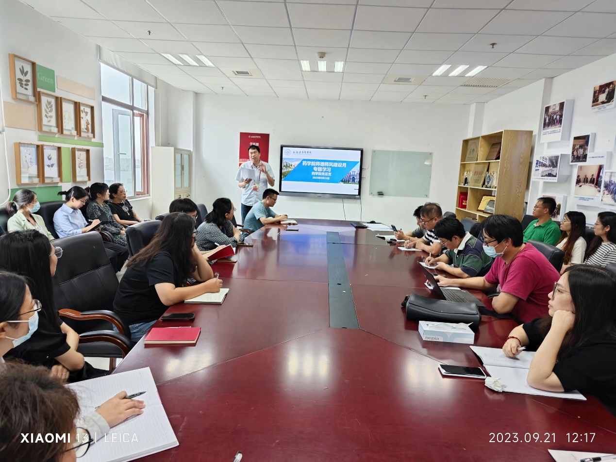 为贯彻落实党的二十大精神,深入学习贯彻习近平总书记关于加快建设中国特色社会主义教育强国重要讲话精神,深入开展好师德师风建设月活动,药学院党总支在9月21日,组织教职工政治学习,党总支书记詹昌明主持了学习。