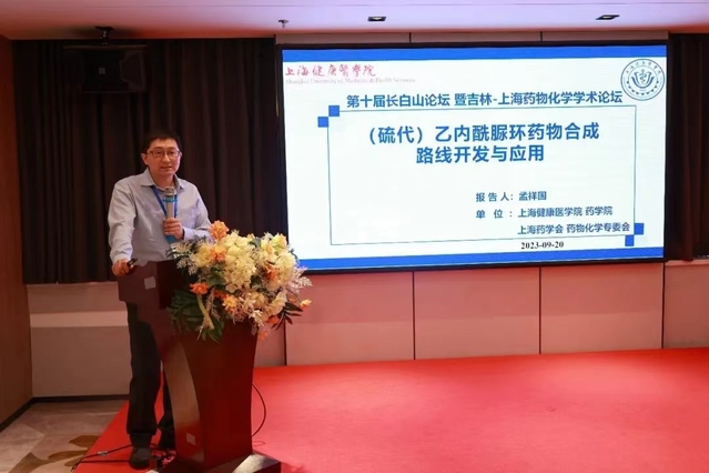 本次会议由吉林省药学会药物化学专业委员会、上海市药学会药物化学专业委员会和延边大学共同主办,以“聚焦长白山天然药物,加快推进创新驱动发展”为主题,来自各大高校、科研院所和企事业单位的200余位药物化学领域科研工作者齐聚一堂,共商创新大计,共谋发展愿景。大会报告环节,孟祥国以“(琉代)乙内酰脲环药物合成路线开发和应用”为主题进行汇报,主要围绕化合物合成路线开发、双靶点化合物设计进行讲述,在学术报告之后还重点介绍了我校发展与学院专业建设相关内容。现场反响热烈,学术氛围浓厚。