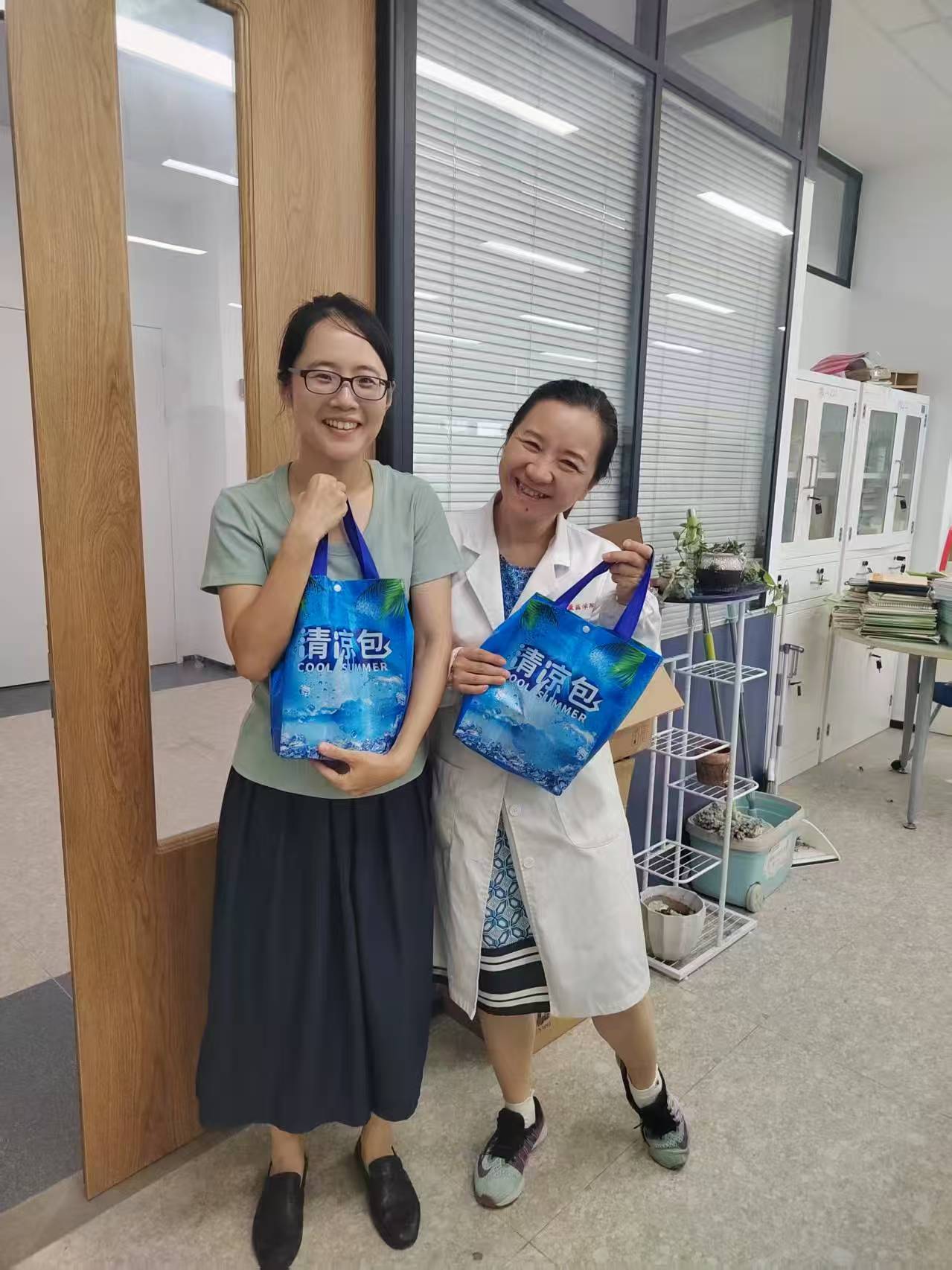 学院工会提前谋划,积极组织调研,根据老师们需求采购防暑降温物资。药学院党总支书记徐一新、工会主席陈晓晶一起深入各教研室、实验室,为在炎炎夏天坚守岗位的吴锴、亓雪等20多位教职工送上清凉包,并与大家亲切交流,了解教学工作情况。