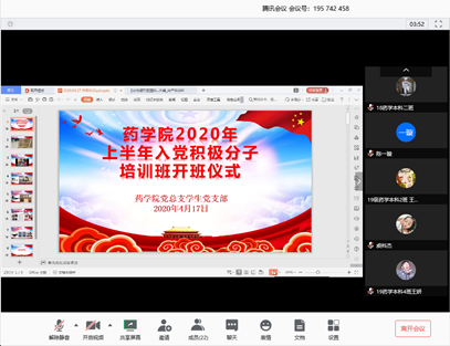 为加强药学院入党积极分子党性意识,深化入党积极分子对党的基本理论、基本路线和基本纲领教育,2020年4月17日中午,药学院党总支学生党支部于线上召开2020年上半年入党积极分子培训班开班动员仪式。药学院党总支书记詹昌明、党总支副书记叶婧、专职党建员陆辉出席会议,会议由学生党支部书记钟旭芬主持,21名学生入党积极分子参加本次开班动员仪式。