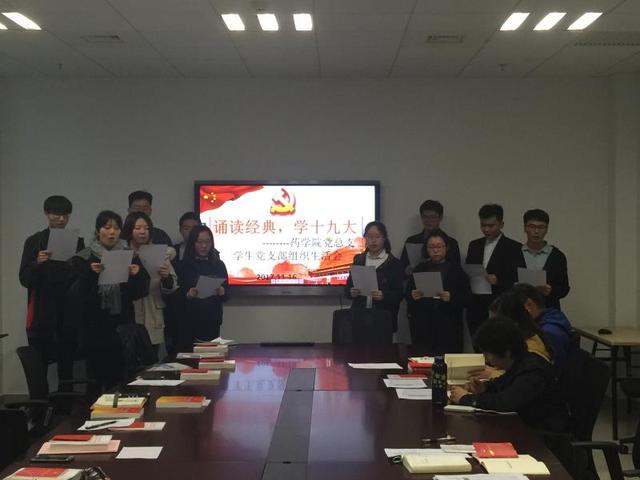 为了学习宣传贯彻党的十九大报告精神,学懂弄通做实党的十九大精神,2017年11月16日,药学院党总支学生党支部开展了“诵读经典,学习贯彻党的十九大”的专题组织生活会。参加本次组织生活会的有党总支副书记叶婧,学生党支部书记邵真如,支部组织委员章蓓意、支部委员曹天晓、付艳君和孙云老师,以及七名学生预备党员和四名拟发展对象。