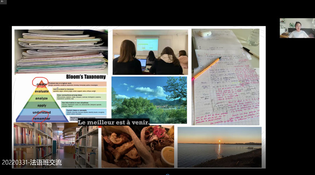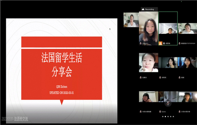 藉中法合作项目新一轮协议签订的东风,为加强项目参与同学对法语学习及未来深造的信心,2022年3月31日21点,药学院通过腾讯会议特邀2021级法国蒙彼利埃大学药物学硕士生----秦紫宸分享留法经验,本次云端见面会由熊野娟老师主持,35名项目参与学生参会。