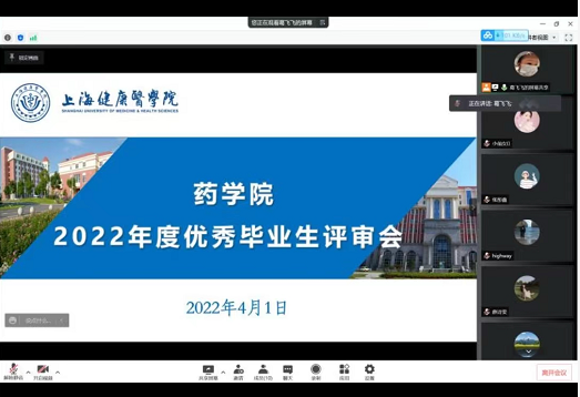 受疫情影响,药学院前期采取学生“云”申请、班级“云”推荐、辅导员“云”审核,使该项工作在公开、公平、公正的氛围下开展。在做好前期工作的基础上,4月1日下午药学院召开2022年度优秀毕业生评审工作线上会议,学院党总支书记詹昌明、学院党总支副书记叶婧、学院专职党建员陆辉、学院药理教研室主任解伟和全体专职辅导员出席了本次会议。为确保评审工作的公正,评审工作采取由副书记、学院专职党建员、教师代表和不涉及评优的班级专职、兼职辅导员担任评委进行投票。评审小组详细审阅了参与优秀毕业生评审的同学提交的申报统计表信息和主要佐证材料,综合评价申报同学入校以来的思想情况、学习成绩、比赛获奖、社会实践、志愿服务和就业等方面取得的成果,对参评学生进行了客观、公正的综合评审和无记名投票,最终评选出药学院2022年度上海市优秀毕业生和校级优秀毕业生(见药学院网站公示)