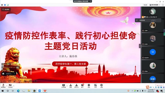 为深入学习贯彻落实习近平总书记关于疫情防控的重要讲话和指示批示精神、李强书记在上海市新冠肺炎疫情防控工作领导小组会议讲话精神和市教卫党委、市教委有关高校疫情防控工作部署,充分发挥药学院学生党支部在疫情期间的战斗堡垒作用和先锋模范作用,加强对学生党员思想政治的引领作用,药学院学生第一、第二党支部于3月30日开展“疫情防控作表率,践行初心担使命”线上主题党日活动。 药学院党总支书记詹昌明、药学院党总支副书记叶婧及支部师生党员参加了此次活动,会议由药学院学生第二党支部书记施春燕老师主持。